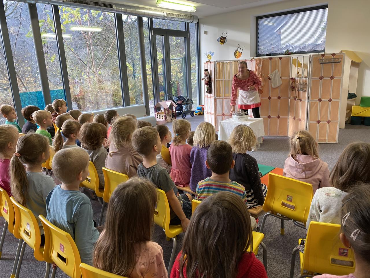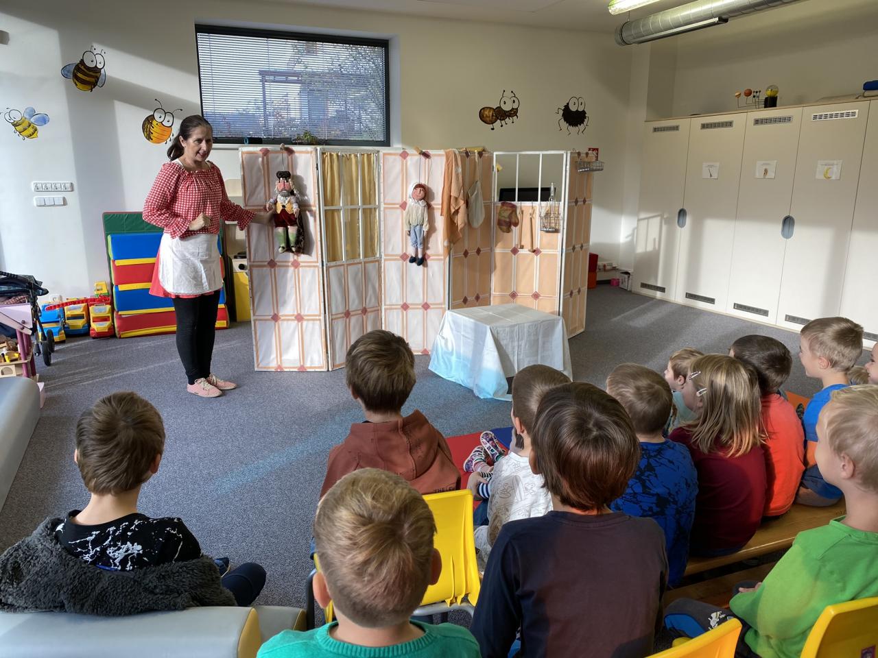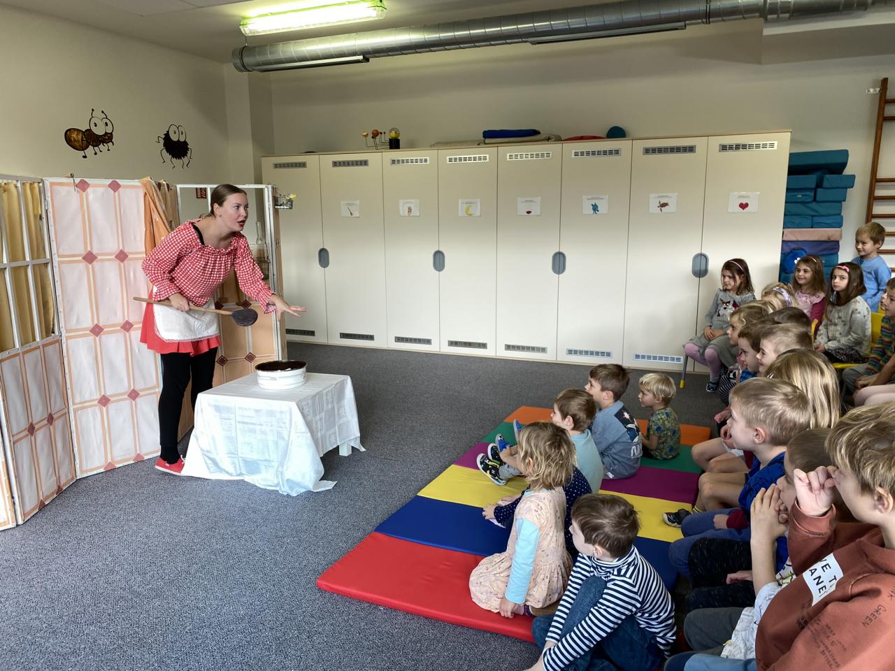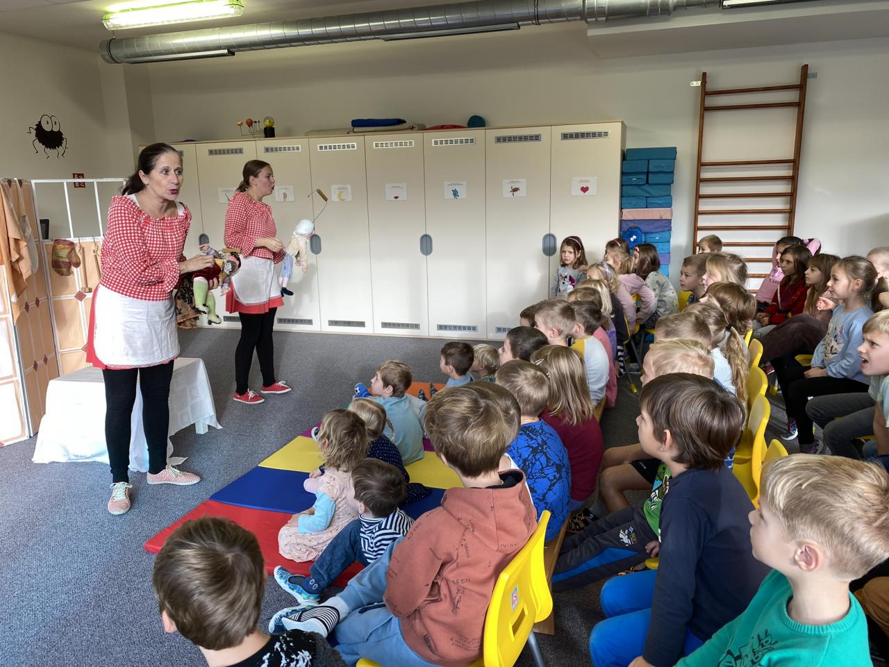 Za dětmi přijelo do školky divadlo Liberta s interaktivní pohádkou O Zlatovlásce, pohádka o chytrém Jiříkovi, mluvících zvířátkách a zlatovlasé panně. Dětem se pohádka moc líbila.