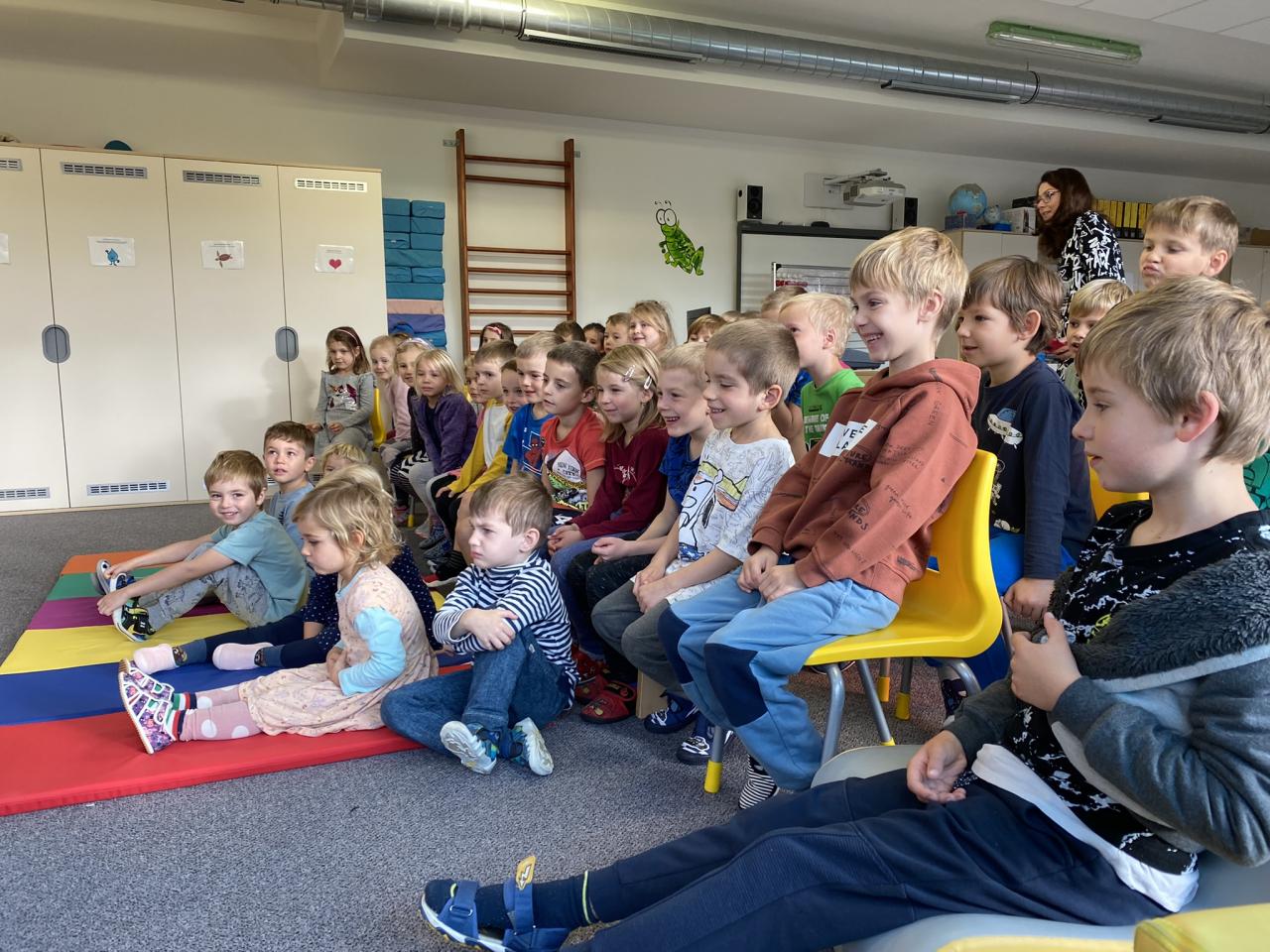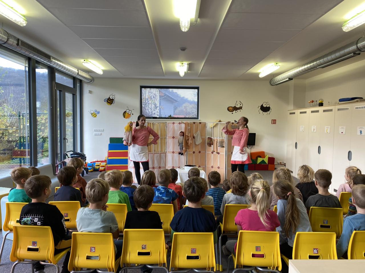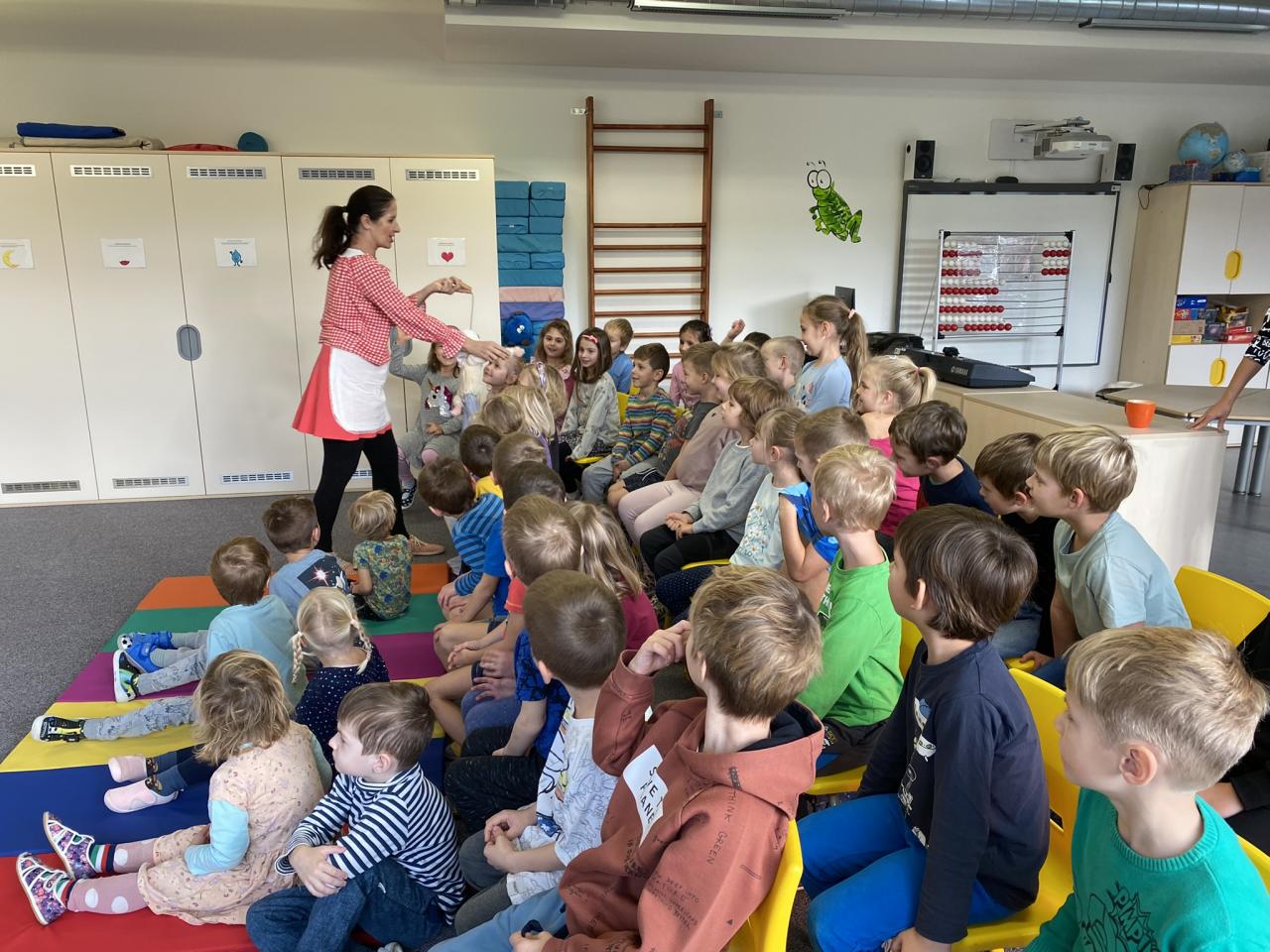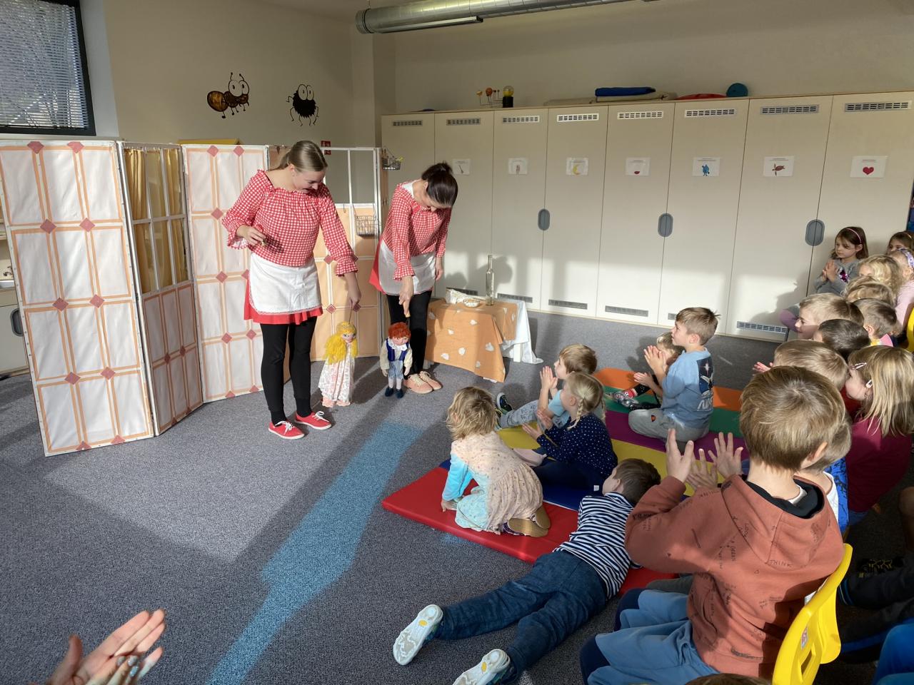 Za dětmi přijelo do školky divadlo Liberta s interaktivní pohádkou O Zlatovlásce, pohádka o chytrém Jiříkovi, mluvících zvířátkách a zlatovlasé panně. Dětem se pohádka moc líbila.