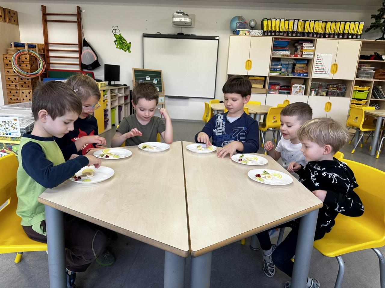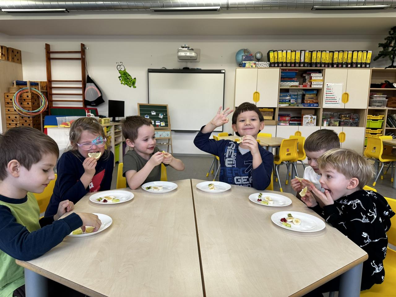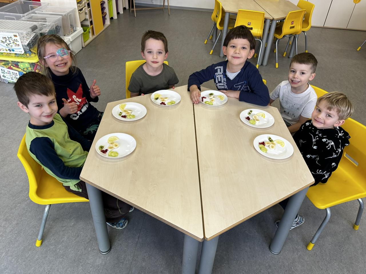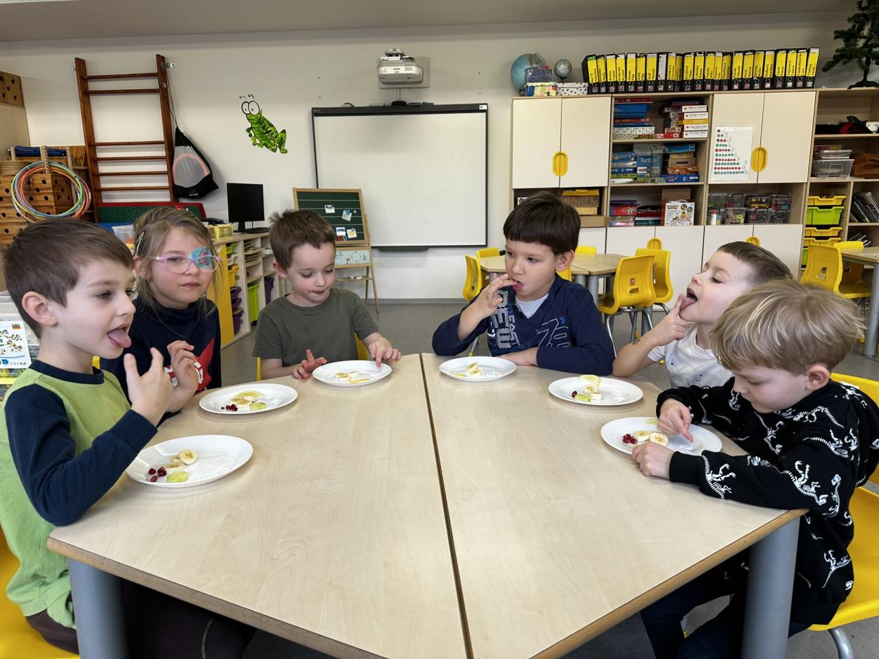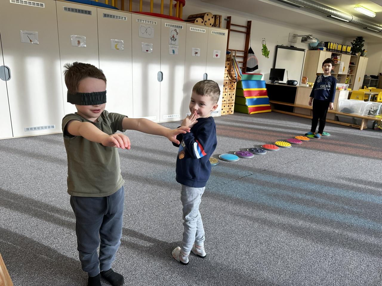 V tomto týdnu jsme s dětmi prováděli zajímavé aktivity zaměřené na vnímání smyslů. Při tvoření děti kreslily oko a do něj nakreslily to, co oko právě vidí. Další zábavou byla hra na zrcadla, kde jedno dítě opakovalo pohyby druhého. Děti ochutnávaly různé chutě a chodily po slepu podle navigátora.