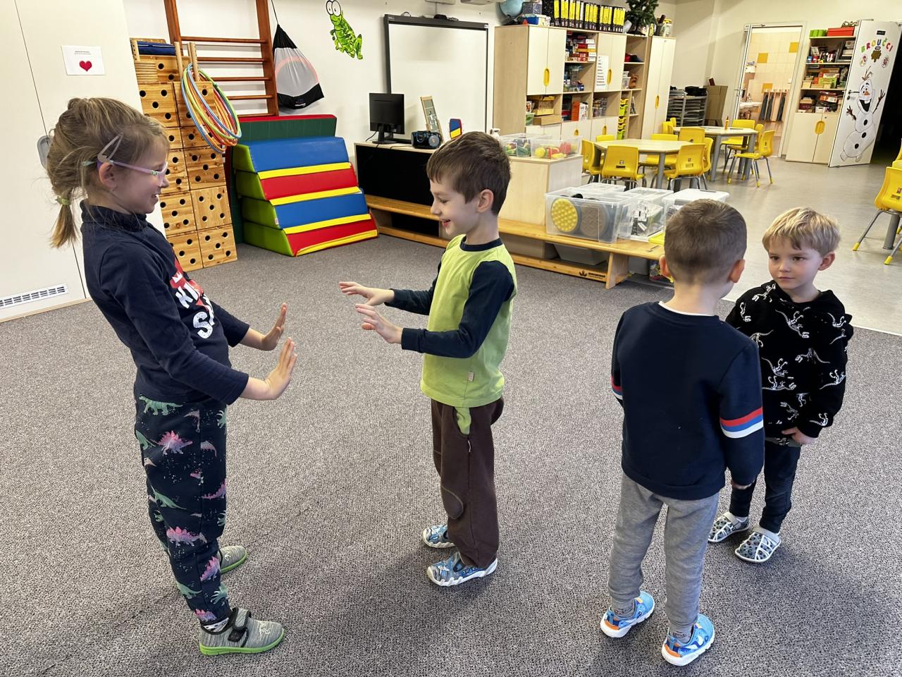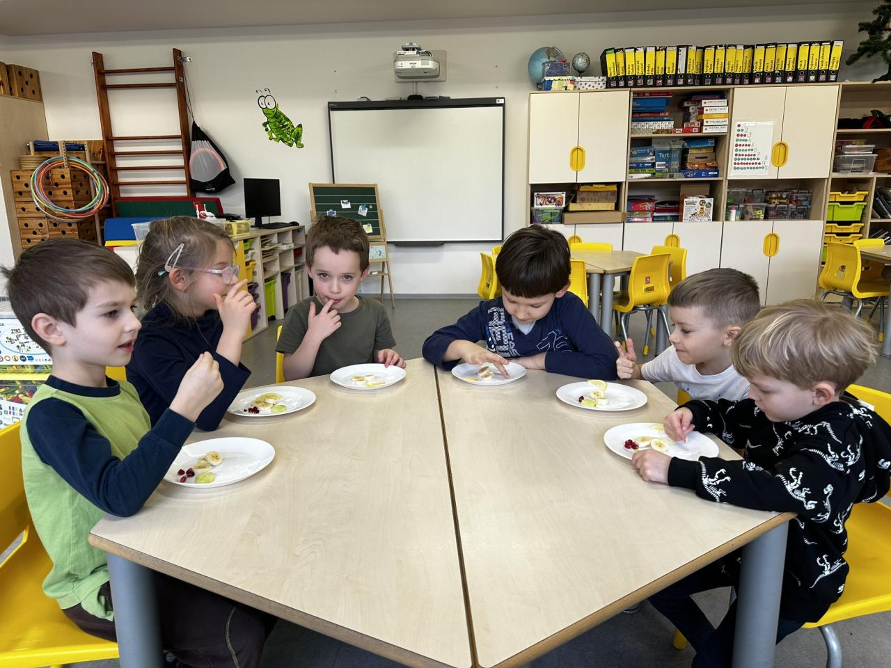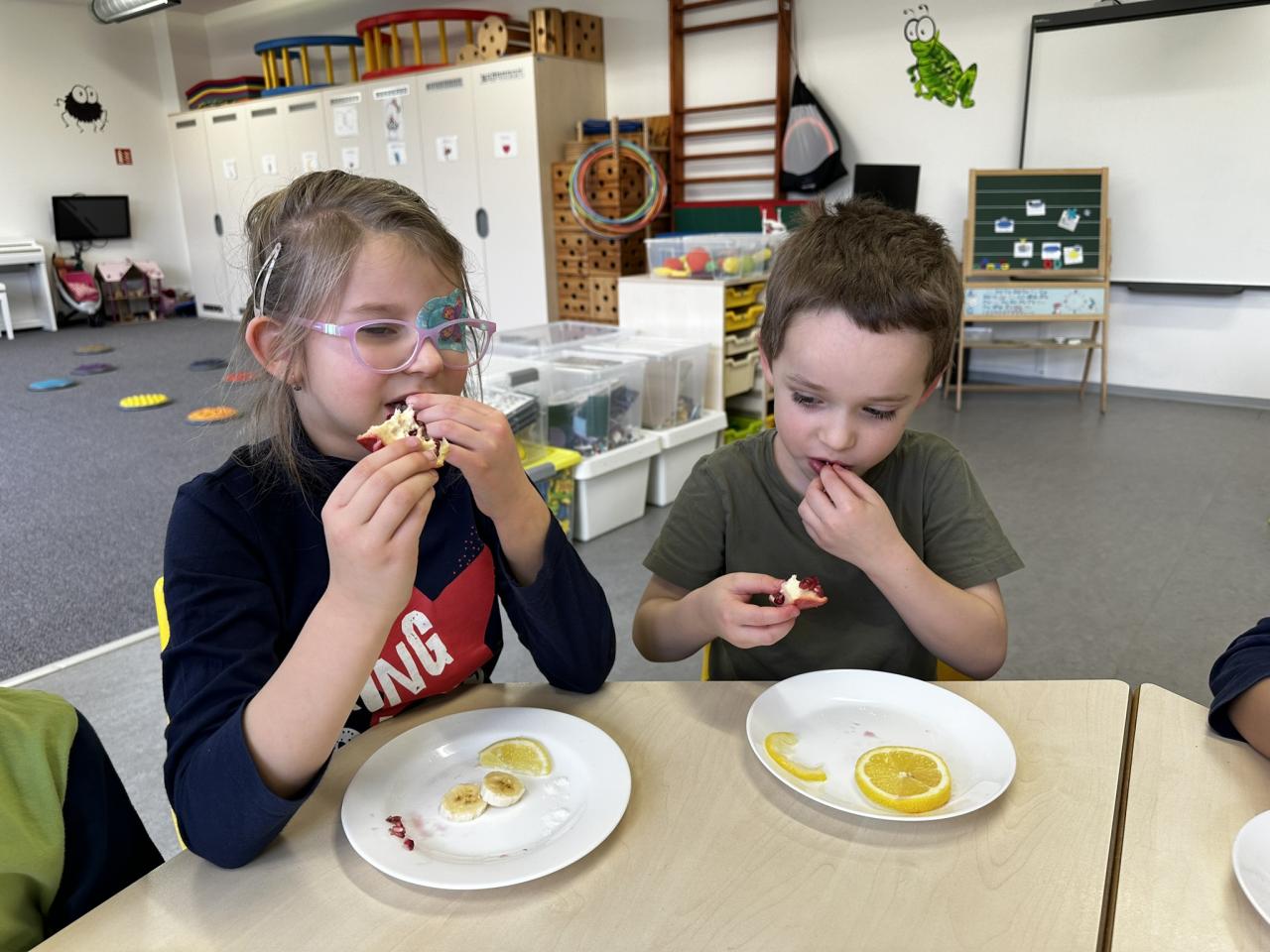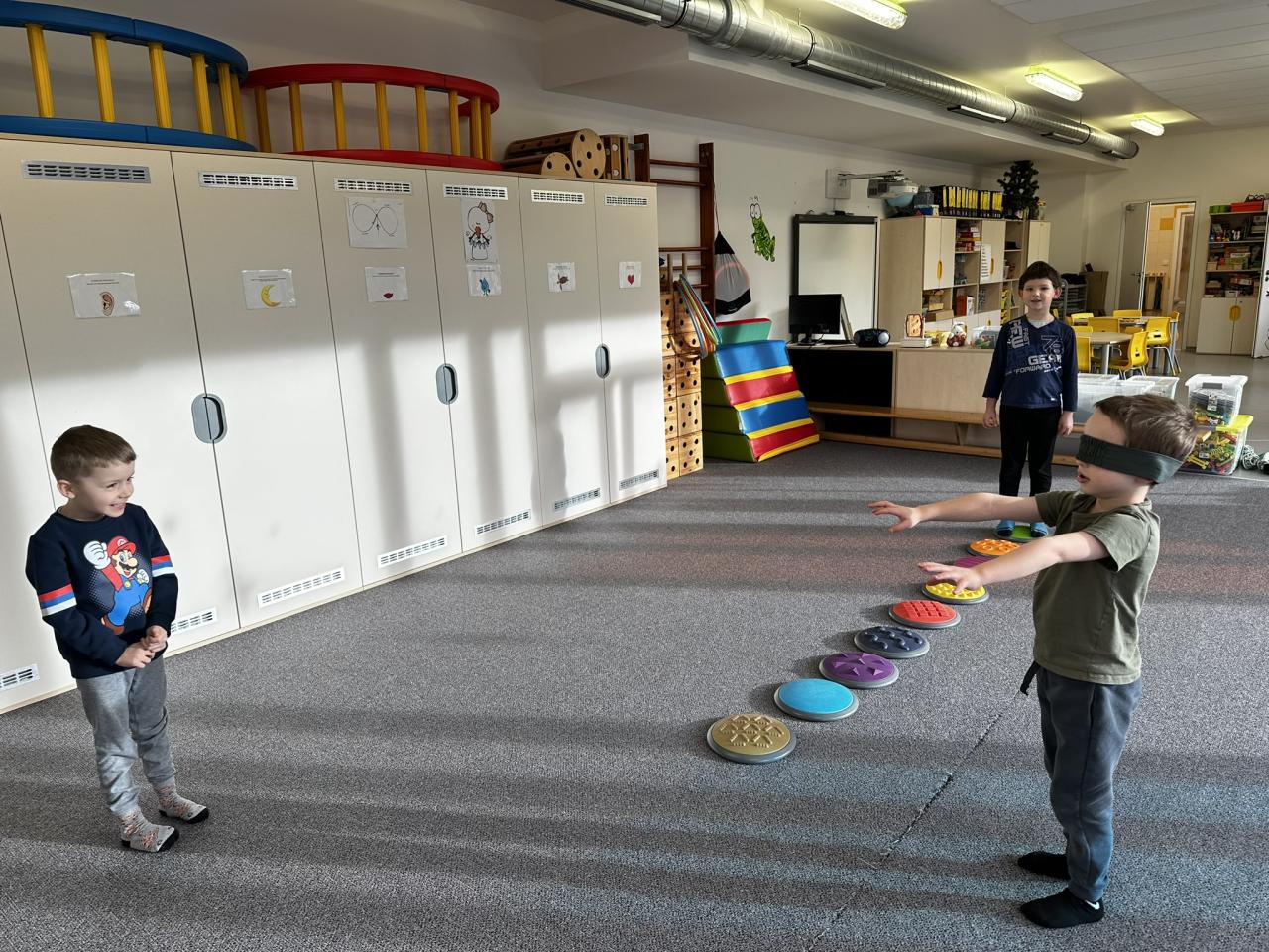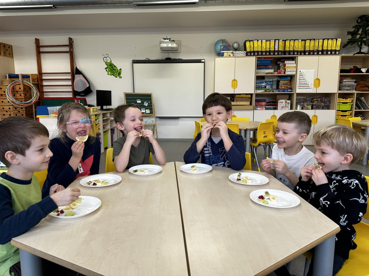 V tomto týdnu jsme s dětmi prováděli zajímavé aktivity zaměřené na vnímání smyslů. Při tvoření děti kreslily oko a do něj nakreslily to, co oko právě vidí. Další zábavou byla hra na zrcadla, kde jedno dítě opakovalo pohyby druhého. Děti ochutnávaly různé chutě a chodily po slepu podle navigátora.