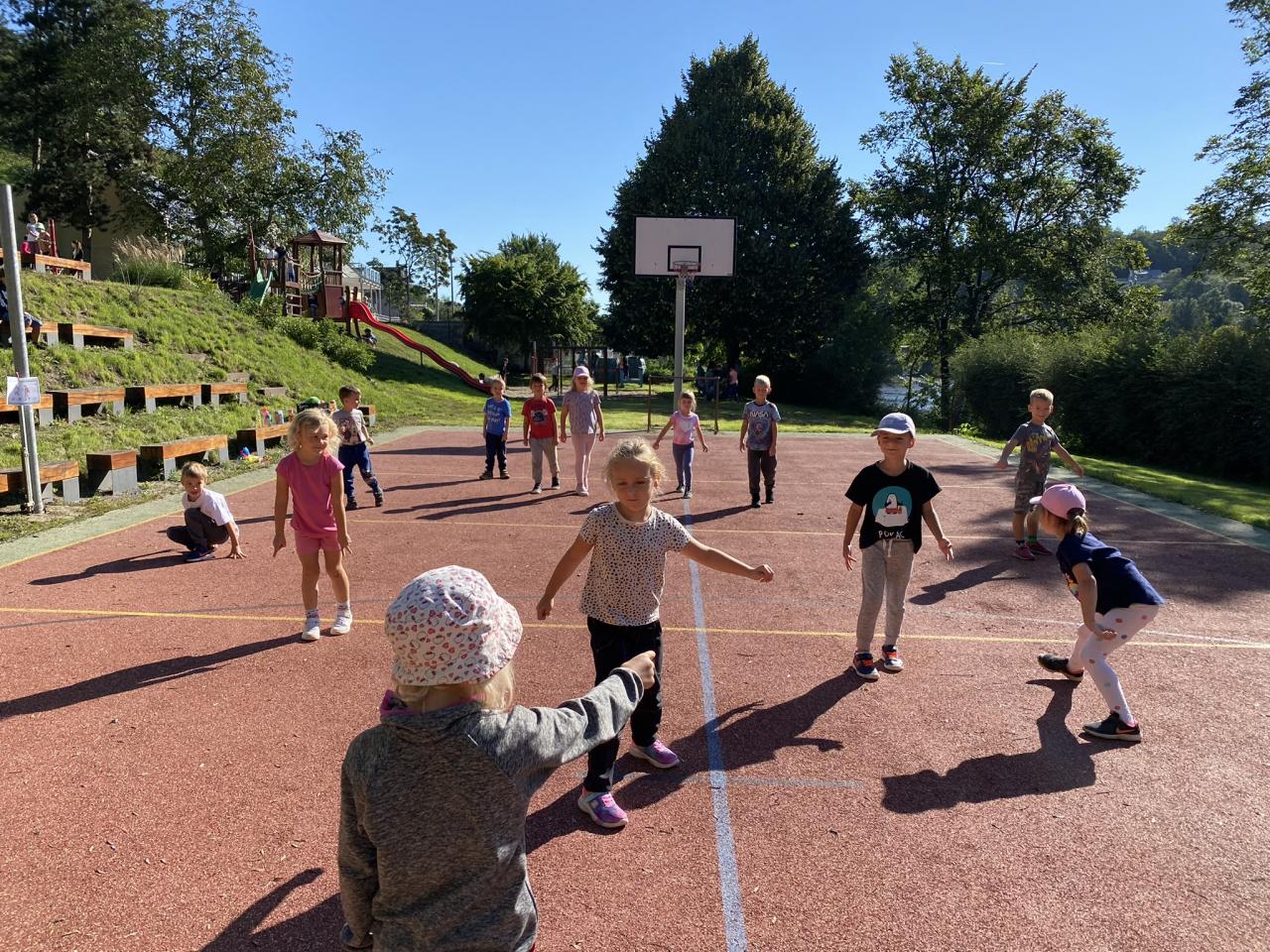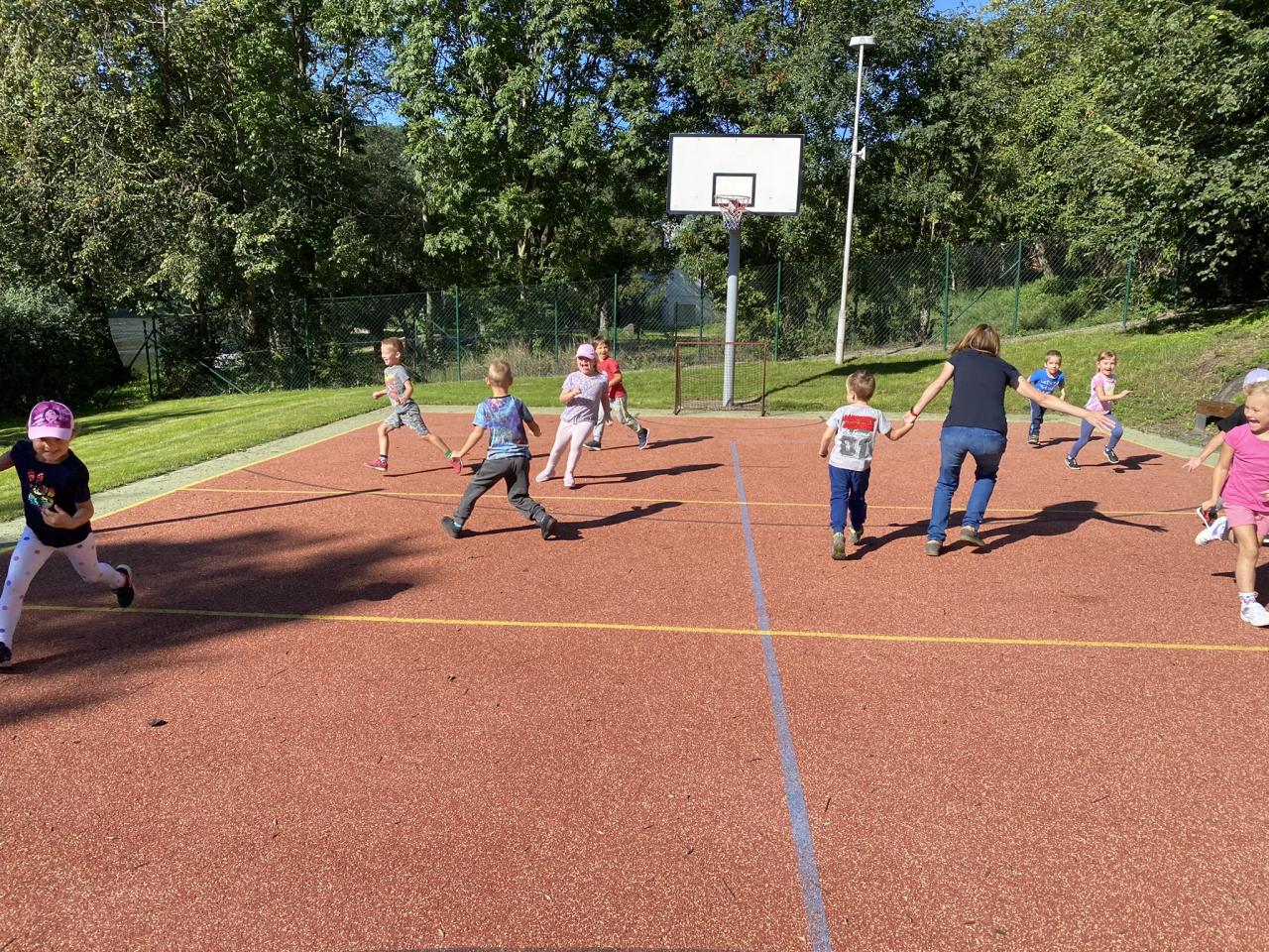 Na naší školní zahradě využíváme spodní velké hřiště hlavně na společné pohybové hry, např. cukr, káva, limonáda nebo Honzo, vstávej! a vždy si to pořádně užijeme.