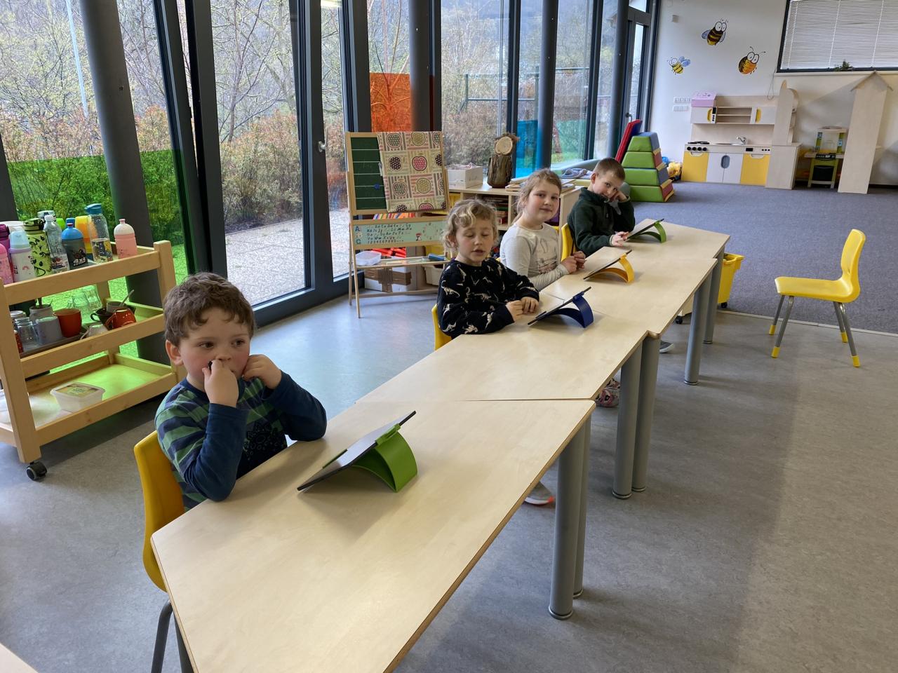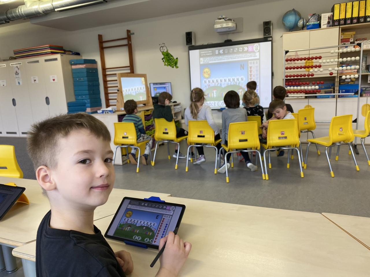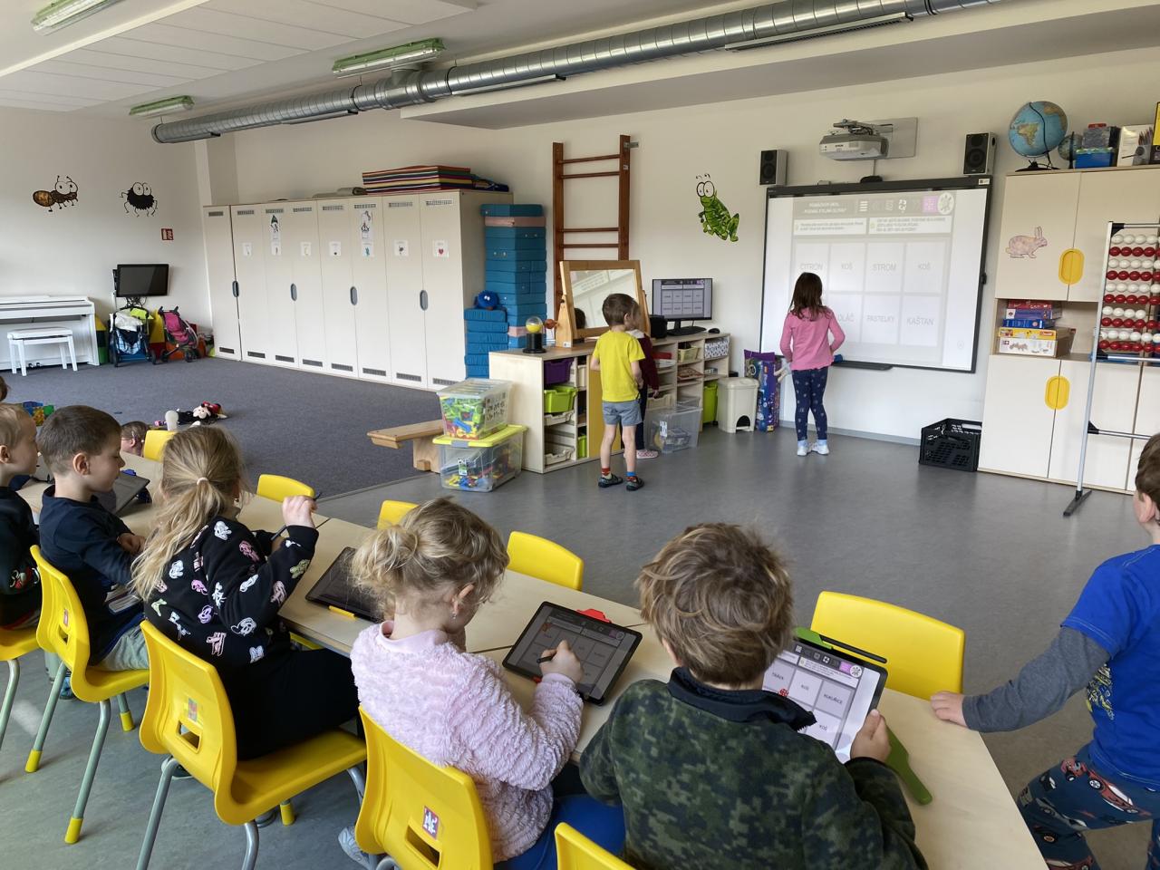 S tabulí pracujeme společně a na tabletech jednotlivě. Zdokonalujeme se nejen v určování hlásek, rozložení slov na slabiky, procvičujeme zrakovou paměť, ale i sluchovou paměť.