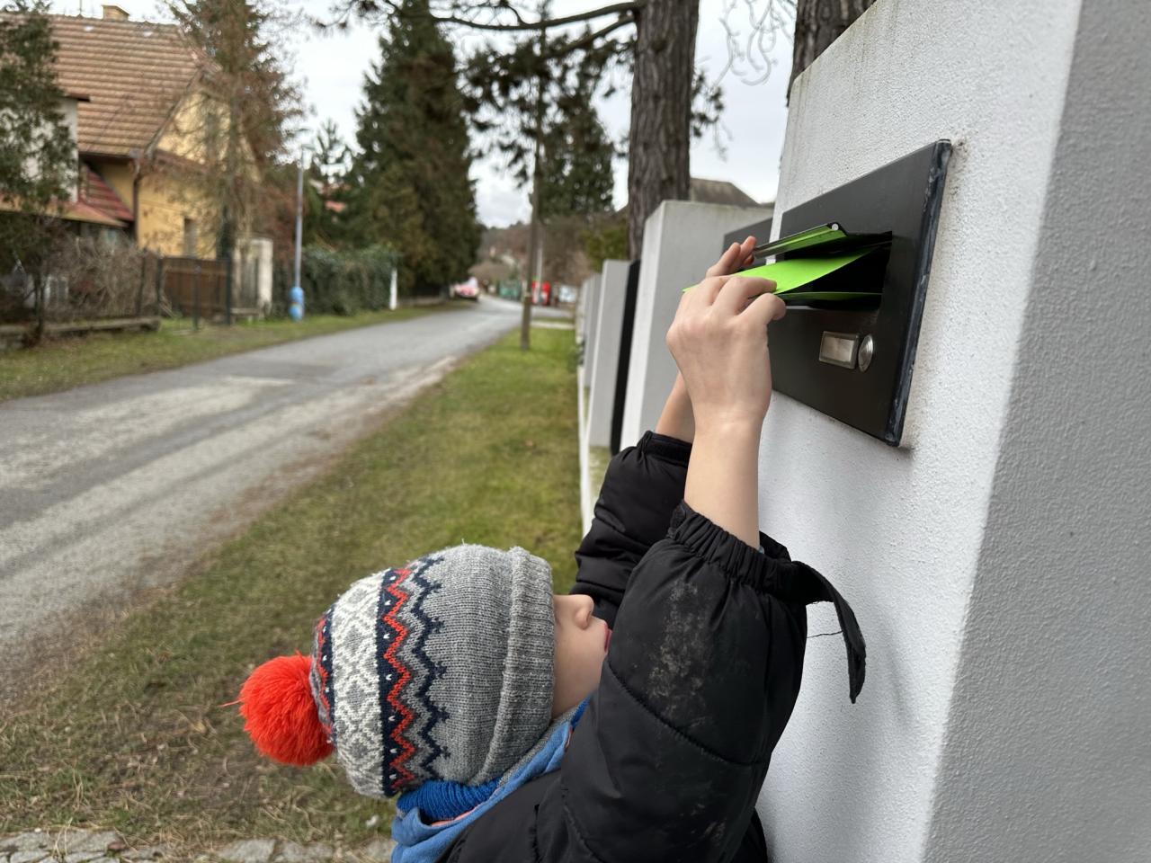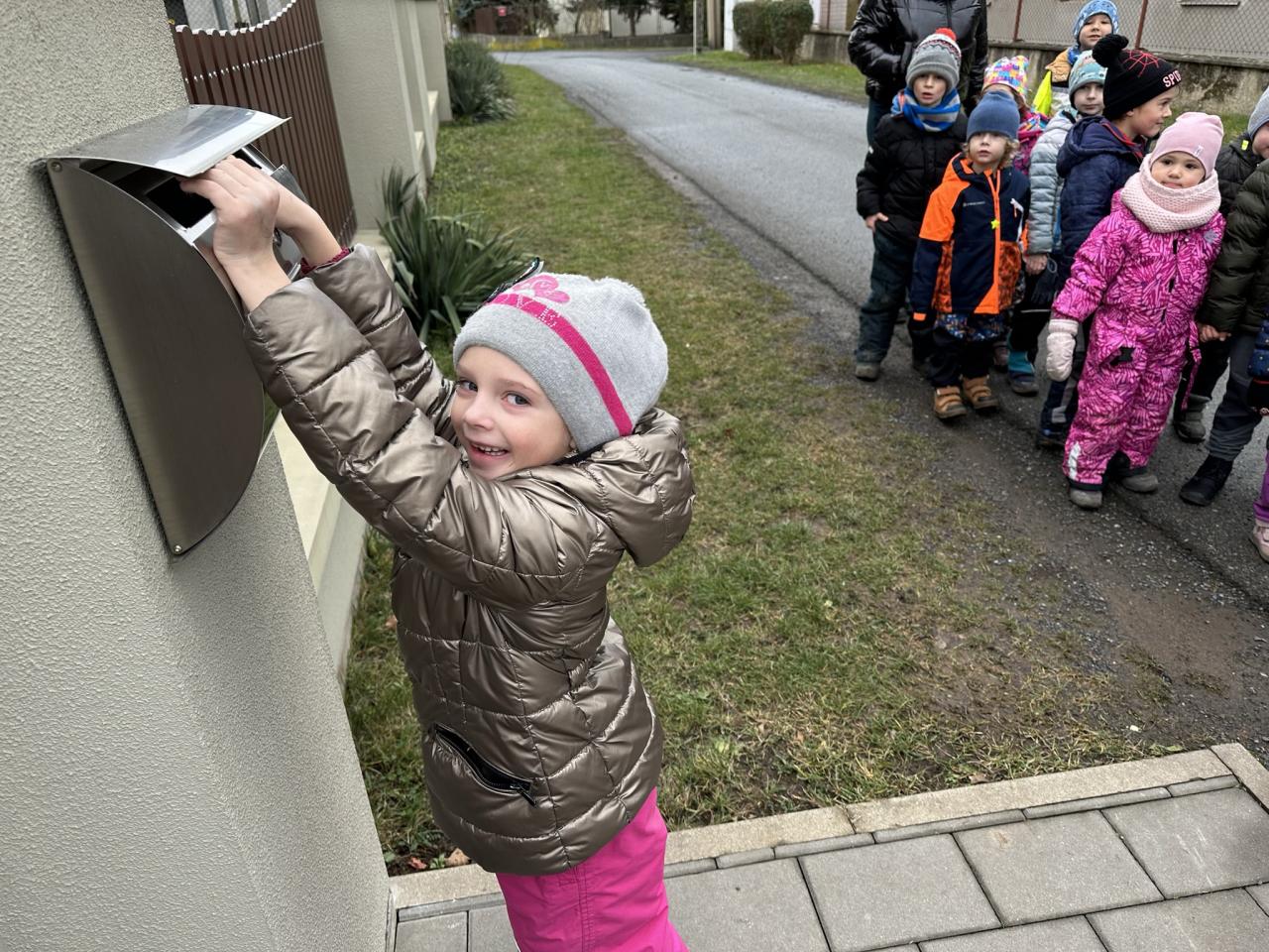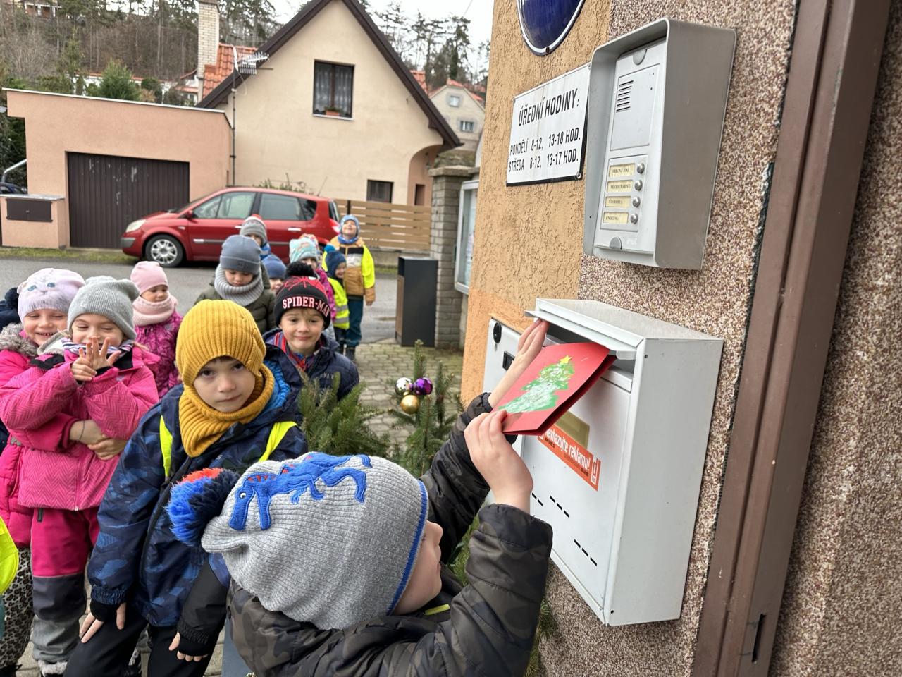 V prosinci jsme vytvořili vánoční přáníčka a vydali jsme se po naší obci. Při procházce jsme zpívali vánoční koledy a roznášeli jsme vánoční přání, které jsme vhazovali do schránek různým lidem. Navštívili jsme pár lidí v naší obci, paní starostku a zastavili jsme se zazpívat i na naší poště.