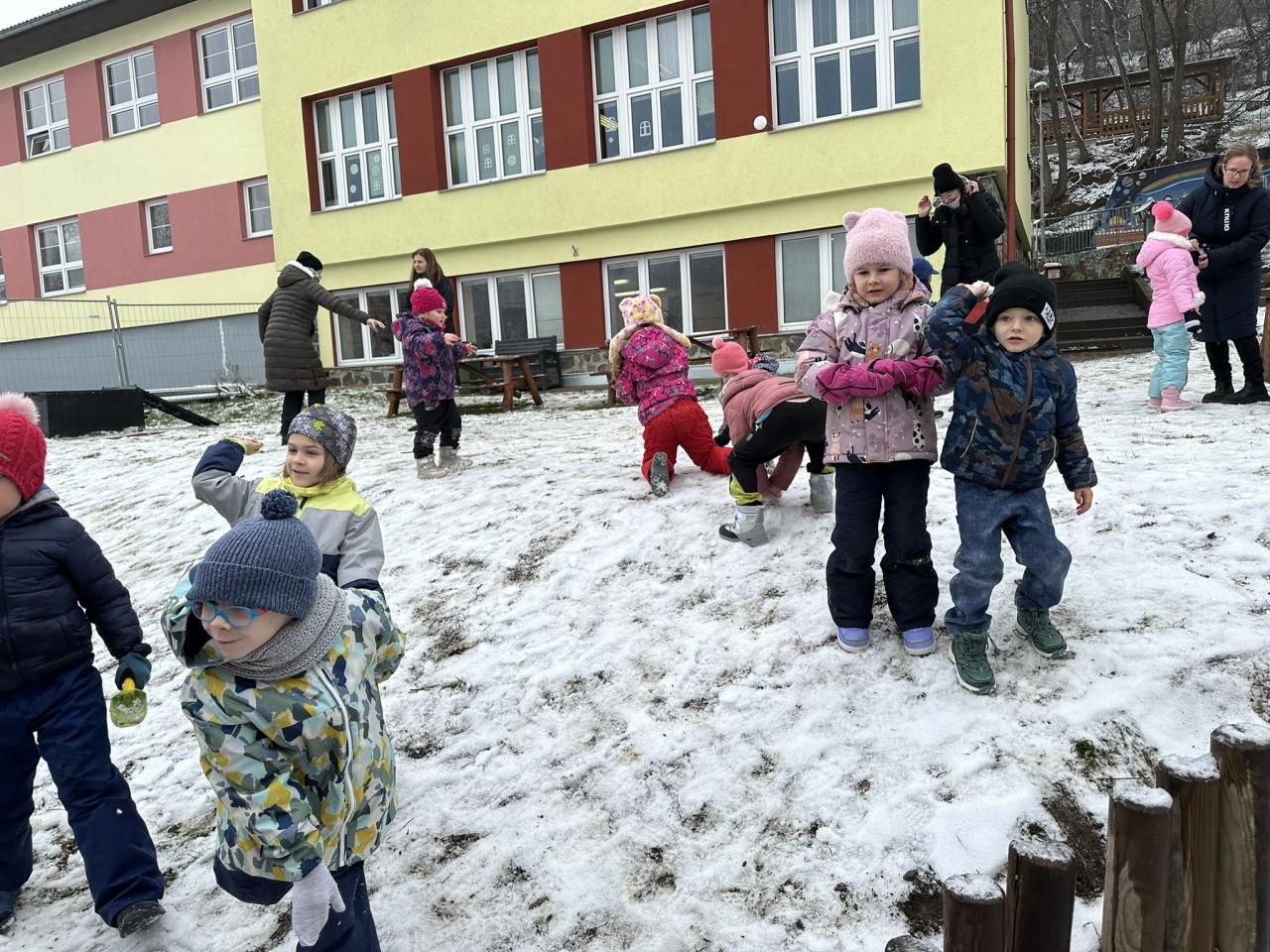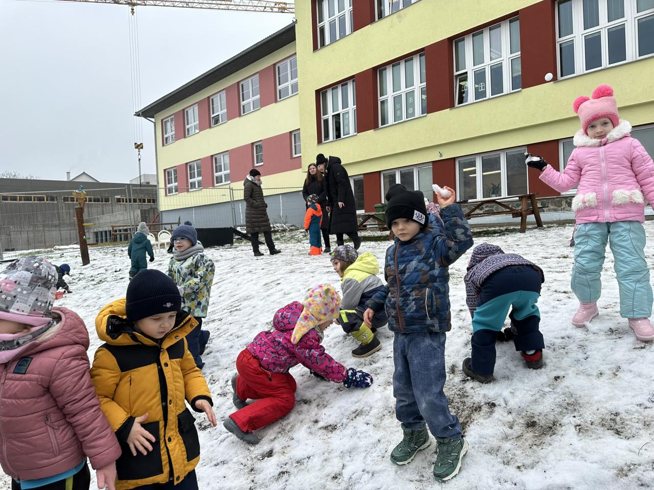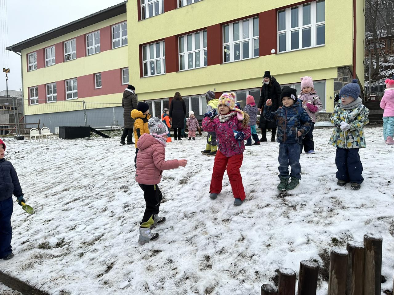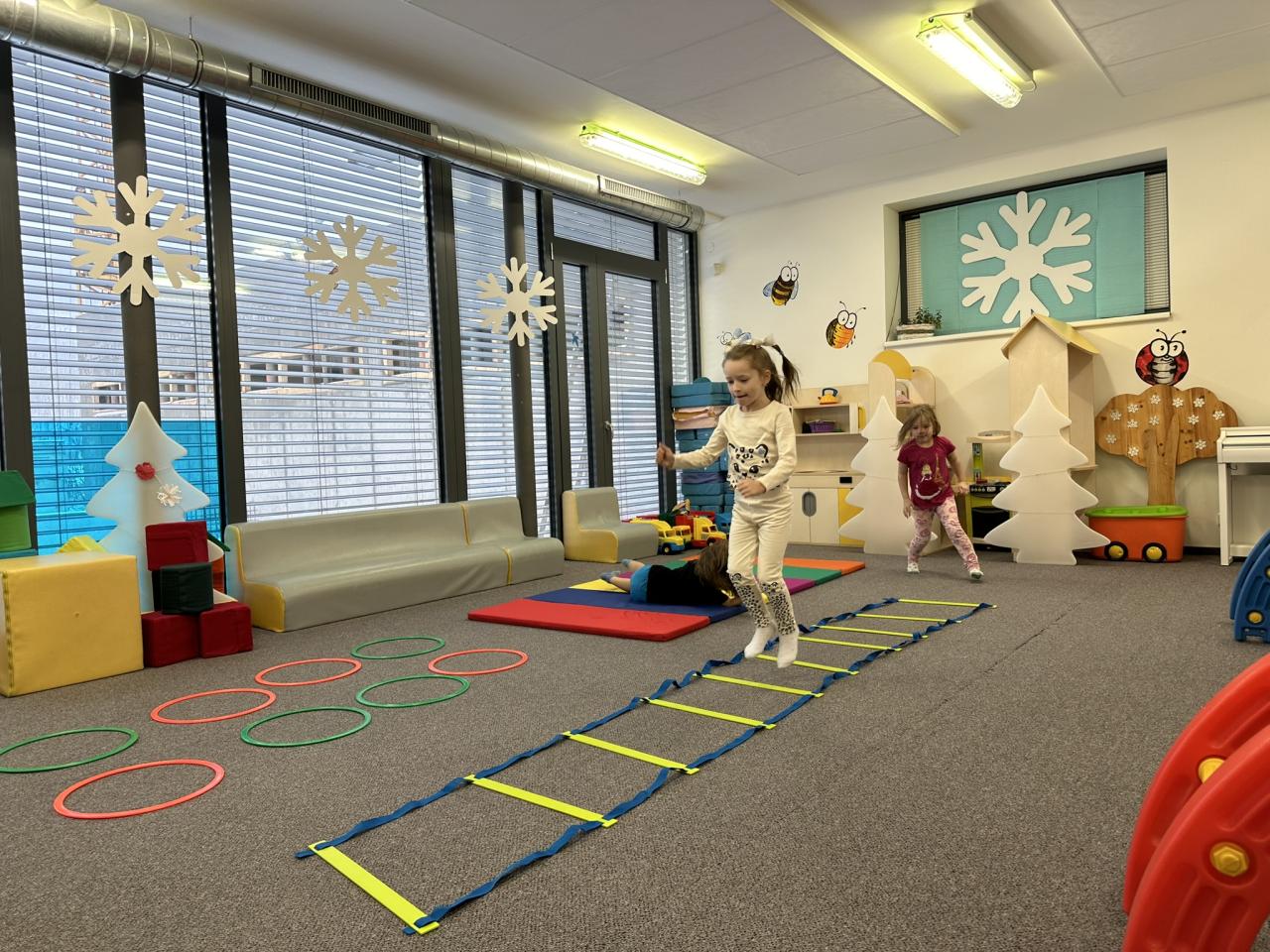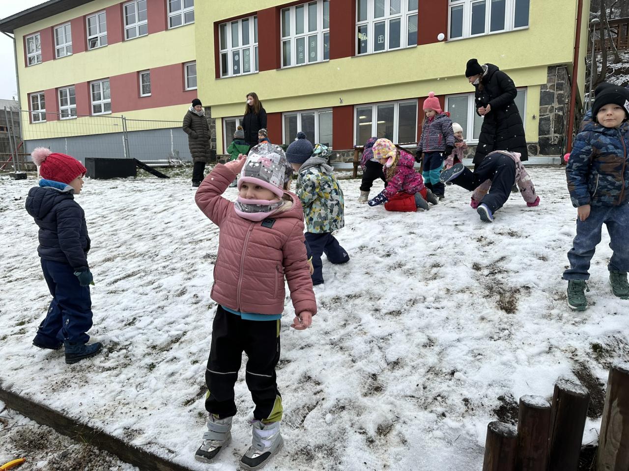 Tento týden děti vyráběly koruny, navrhly a postavily si překážkovou dráhu a při pobytu venku si užily koulování na sněhu.