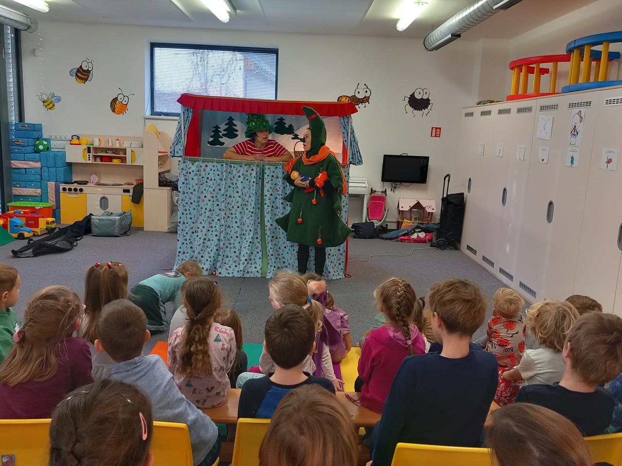 Do školky přijelo divadlo Koloběžka s pohádkou „O veselém vánočním stromečku“ Pohádka zpříjemnila dětem předvánoční čas a čekání na Ježíška.
