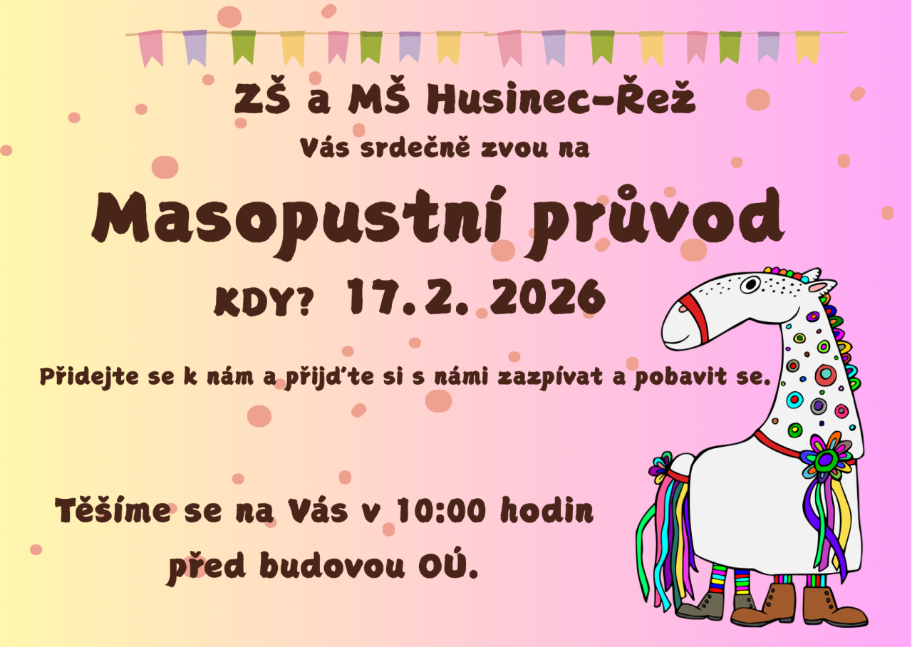Zveme všechny děti, rodiče, prarodiče i širokou veřejnost na veselý masopustní průvod plný masek, hudby a dobré nálady!