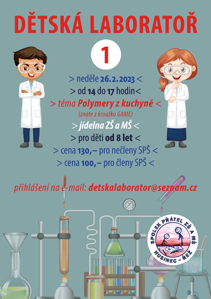 SPŠ zve malé badatele na workshop "Dětská laboratoř", který se bude konat v neděli 26.2. od 14 do 17 hodin v jídelně ZŠ a MŠ Husinec-Řež.
