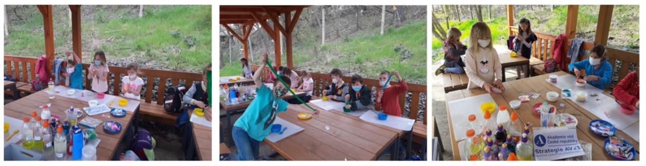 Návrat od počítačových obrazovek k osobnímu setkávání jsme na kroužku velkolepě oslavili. Věřte, že děti nic nepotěší tolik jako možnost vyrobit si vlastní sliz. Ale není to ledajaké patlání. Jde o přípravu polymeru, tedy dlouhatánské a propletené molekuly, která vznikne reakcí polyvinylacetátu (lepidlo) a roztoku kyseliny borité (aktivátor). Přísady jako třpytky, kuličky a barviva se postarají o zábavnější výsledek, trocha tělového krému pak o vůni a šetrnost k pokožce. Děkujeme programu Strategie AV21 č.10 - Molekuly a materiály pro život za pořízení pomůcek a surovin.